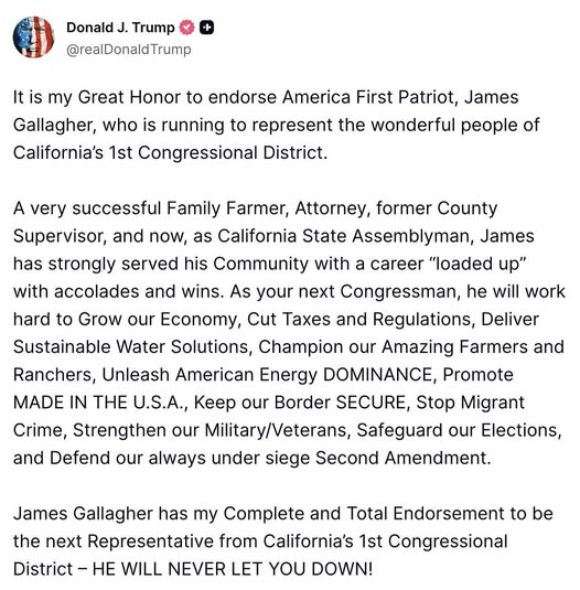 It was a packed room for the Butte County GOP Central Committee, where members voted unanimously to endorse James Gallagher to run in a special election for Congress to fill the seat left vacant by our dear friend, the late Honorable Congressman Doug LaMalfa .